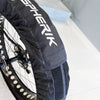 Made of 600 deniers polyester (top) et nylon (side), elastic bands and velcro attach. Fit wheels from 26"x4.0 to 27.5"x3.8 to 4.5. Saled by pair.