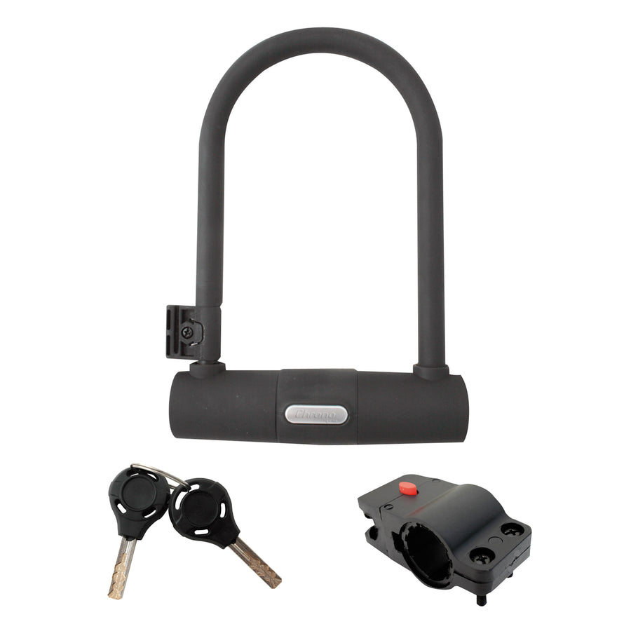 Hardened steel U-lock with anti-drill cylinder and dust cover.